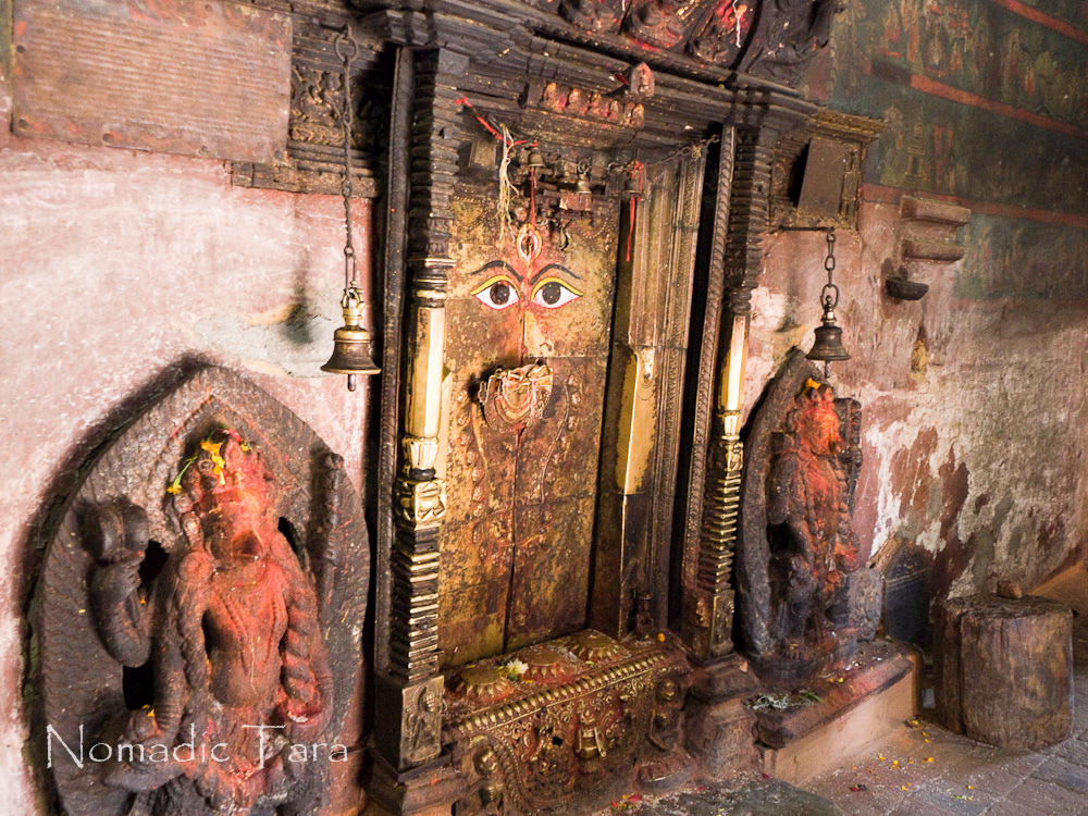 Buddha with offerings of rice, vermilion and marigolds in Nepal...